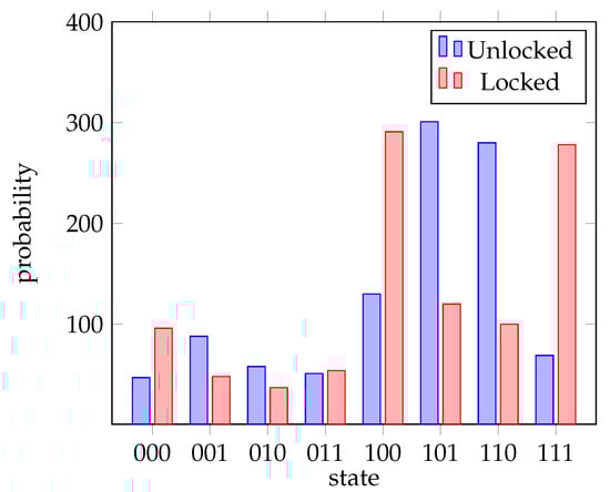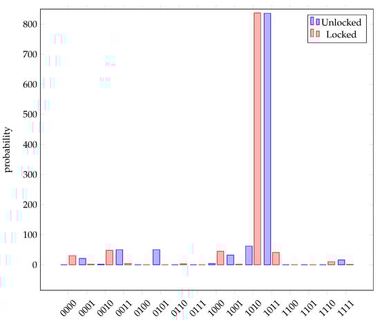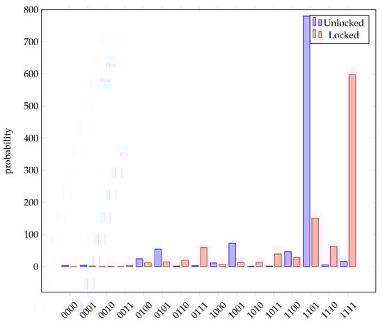 Experimental results for Grover circuit. Unlocked results show the correct output from the circuit, whereas locked results show what happens if input keys are not applied.