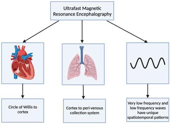 Ultrafast magnetic resonance encephalography (MREG) can produce an image of the brain within 100 milliseconds [8]. Combining ultrafast MREG with cardiorespiratory monitoring allows for whole-brain coverage and allows for the analysis of all physiological pulsations [57]. Human studies using ultrafast MREG have found that there are three distinct pulsation mechanisms that maintain the flow of CSF and elimination of waste products within the brain: very low frequency (<0.1 Hz), respiratory (0.2–0.3 Hz), and cardiac (0.8–1.2 Hz) (Figure 4) [58]. The primary contributor to bulk CSF flow and exchange of CSF with interstitial fluid is believed to be arterial pulsations that occur during cardiac systole, allowing for solutes to move from the peri-arterial spaces into the extracellular brain tissue [59,60].
