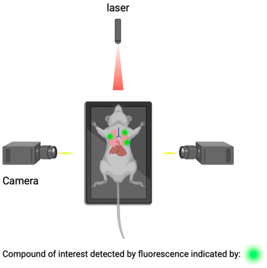 Macroscopic imaging techniques include the utilization of macroscopic CSF tracers, transcranial macroscopic imaging, and fluorescence macroscopy. These imaging techniques utilize the use of fluorophores to bind to compounds of interest and provide quantitative information on compound concentrations and distribution through optically turbid media, such as tissue (Figure 5). The use of this technology allows for the possibility to study and analyze intact organ structures and provides information about how therapies can be more optimally administered to reach their target destination, and it can be used for guidance during operations such as brain tumor resections [69,70].