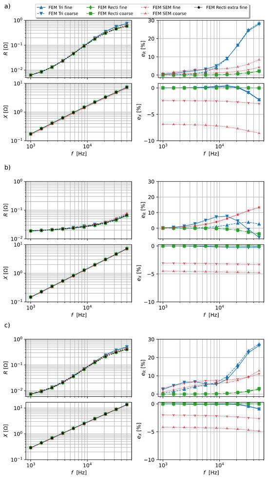 The AC resistance R and reactance X of (a) MFT 1 (b) MFT 2, and (c) MFT 3 computed using extra-fine, fine, and coarse mesh elements with triangular and rectilinear shapes, as well as the hybrid FEM–SEM method and the corresponding deviations from the extra-fine reference model.