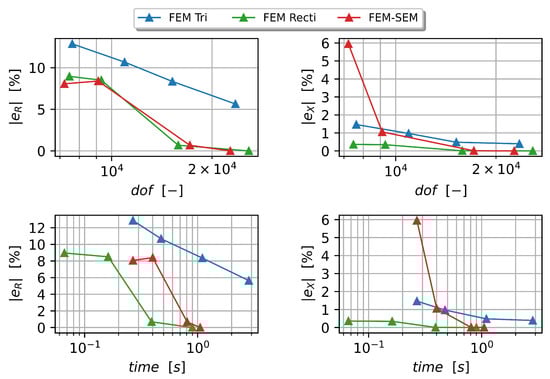 The hybrid FEM–SEM model exceled in terms of the number of unknowns employed and the computational efficiency it provided when compared to the traditional FEM models, as can be seen in Table 2. However, the FEM with rectangular mesh shapes also delivered competitive results due to its accuracy, irrespective of the number of degrees of freedom used. In contrast, the FEM with a triangular mesh lagged in terms of both the accuracy and degrees of freedom when subjected to comparison.