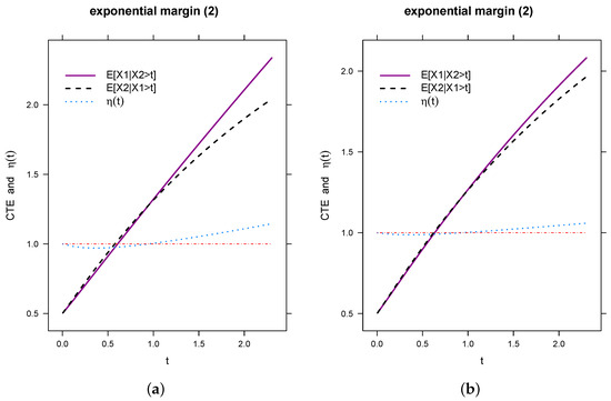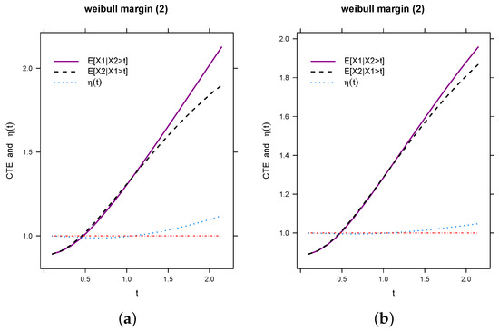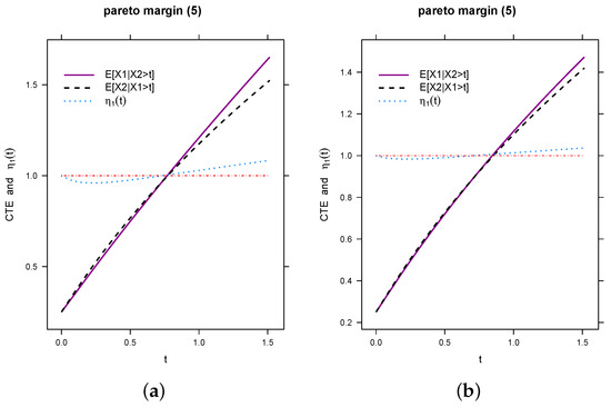 In Figure 1 we present a simulation using the Laplace approximation. In Figure 1a we take and as and , respectively. In Figure 1b we reduce such that its value comes closer to . We do this because if and are the same, we get exchangeability as the result of symmetric copulas. In these two panels we assume and throughout this simulation. The values of and are very high. The main reason is that, if we take lower values, the distance between two conditional expectations are so big that we cannot find any pattern. Apart from that, these Laplace approximation simulations look similar to the simulations when we use Pareto margins and use the definitions of conditional expectations.
