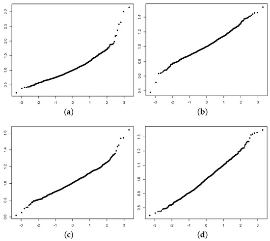 where is slowly varying function with as , for functions . Therefore, . For , the tail-dependence parameter becomes the tail dependence coefficient [11,12]. While widely used, the tail dependence coefficient tends to underestimate the extent of tail dependence. This is due to its focus on measuring the rate of decline of joint tail probability exclusively along the main diagonal of [5]. Furthermore, the tail dependence coefficient falls short in capturing non-exchangeable tail dependence situations, where holds true, and represents the copula of the random variables [1,6]. Furman (2015) [7] confronts these challenges by proposing adjustments to the tail dependence coefficient, opting to substitute the diagonal with the path that optimizes joint tail probability. Yet, the estimation of these tail indices proves to be notably challenging, primarily due to the intricate nature of determining the path that maximizes dependence for a copula within a broad context. A parallel endeavor to quantify non-exchangeable tail dependence was undertaken by Genest and Jaworski (2021) [13].