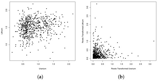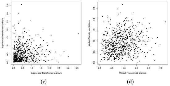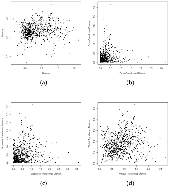 Scatter plots of the observed joint distribution between Uranium and Titanium for the original and transformed marginal data. Panel (a) represents the scatterplot from raw data. Panel (b–d) are the scatterplots after Pareto, exponential and Weibull transformations respectively.