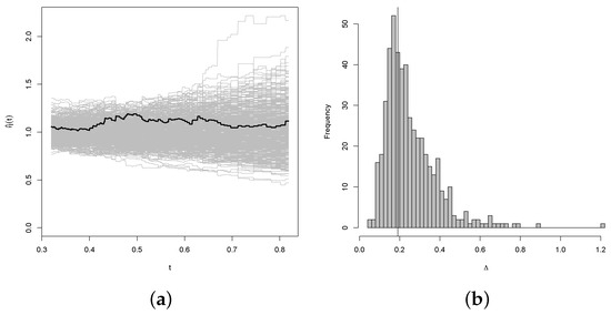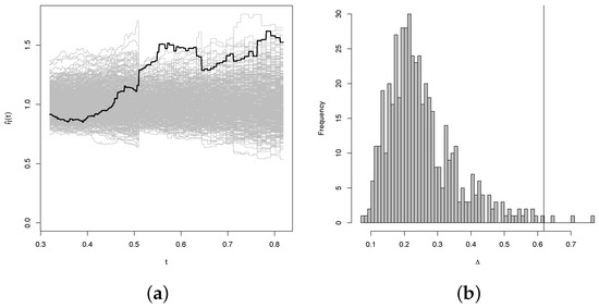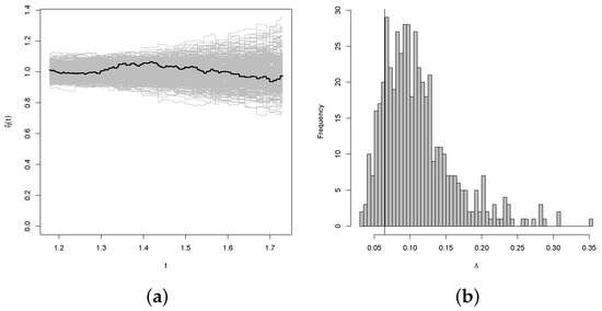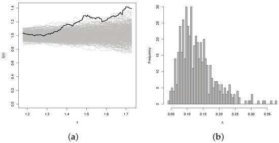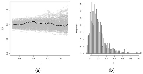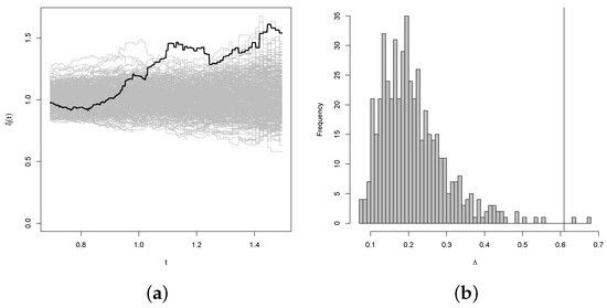 Results of the bootstrap test of the null hypothesis of exchangeability for the joint distribution of Uranium and Titanium with exponential marginal distributions. The thick line in panel (a) represents the expectation of the simulation. Panel (b) represents the histogram of the simulation.