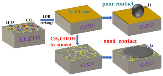 Yang et al. found garnet-based ASSBs to be promising, owing to their high energy density and safety features. However, the widespread adoption of these batteries faces challenges, primarily from the accumulation of Li2CO3 contaminants on the surface of the SSE [38]. These contaminants can impair battery performance by hindering interface contact and promoting dendrite formation [39]. Li et al. focused on investigating the growth process of Li2CO3 on the surface of the solid-state electrolyte Li6.4La3Zr1.4Ta0.6O12 (LLZTO) and proposed an innovative approach for effectively removing these contaminants as shown in Figure 2. This approach involves immersing LLZTO electrolytes in pure CH3COOH (acetic acid) for a brief duration of 1 min [14]. This treatment effectively removes Li2CO3 contaminants from the surface of the electrolyte, significantly reducing the interface resistance between lithium and LLZTO from 5542 to 5 Ω cm2.