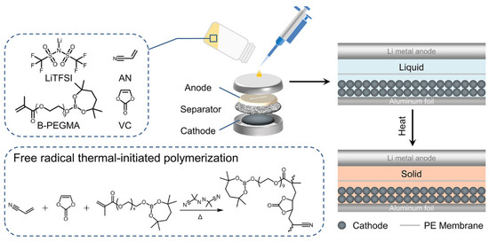 Schematic diagram of the approach recommended by Liu et al. for preparing a solid-state polymer electrolyte through in situ polymerization via thermally initiated free-radical reaction. Reprinted (adapted) with permission from [15]. Copyright © 2024 American Chemical Society.