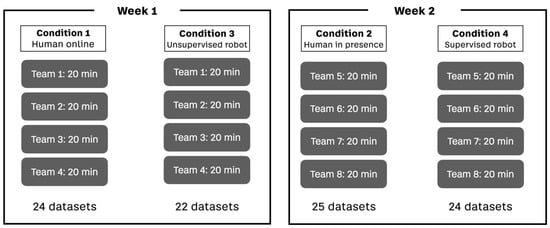 In this within- and between-subjects study, forty-nine undergraduate students participated in two out of four conditions. There was a total of eight student teams, and each team participated in one human-facilitated and one robot-facilitated condition. Teams 1–4 participated in C1 (human online) and C3 (unsupervised robot), while teams 5–8 participated in C2 (human in presence) and C4 (supervised robot). This arrangement ensured that each student team had exposure to both human and robot facilitation, allowing a nuanced exploration of the different approaches to CL facilitation.