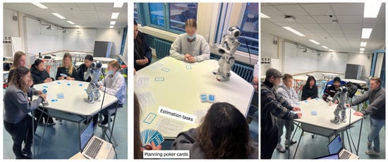 The study explored four different types of human and robot facilitation in the game of planning poker as a collaborative learning activity with undergraduate students on the course on agile project management in the study programme Digital Economy (BSc.) at a university of applied sciences in Germany. Throughout this course, students gain a solid understanding of agile principles and project management practices via a series of interactive seminars and project-based activities. The game of planning poker is introduced in this course as a method for the relative estimation of tasks in a project along with other estimation techniques such as story points. Planning poker is a game-based technique for relative effort estimation in agile teams, who estimate the effort needed to complete tasks in relation to each other [,]. Typically, the game of planning poker is played in small teams and is guided by a human facilitator who ensures that the method is used in a proper way [,]. In the game of planning poker, all participants are encouraged to make an individual estimation and reach a consensus. The game of planning poker as a CL activity focuses on peer communication, making decisions, negotiating, and justifying standpoints in the process of consensus building. Since a consensus is required for the successful completion of the game, team discussions aim at sharing different perspectives and influencing each other’s assessment of the effort required for completing the project tasks which are estimated during a planning poker session.