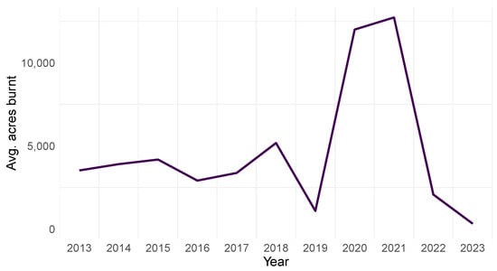 Using the data described above, we combine fires of all sizes in each year. Figure 1 shows the average acres burned from 2013 to 2023. A large number of fires occurred in 2018, 2020, and 2021. This was caused by three record-breaking fires that were so large that they increased the average dramatically in each of these years. The 2018 Mendocino Complex fire, which burned through counties including Colusa, Lake, Mendocino, and Glenn, was the most expansive fire in California’s history. These fires have burned approximately 460,000 acres of land []. In 2020, the August Complex fire burned a final total of 1,032,648 acres, resulting in the largest fire burned in California. In 2021, the Dixie fire burnt even more land mass than the August Complex fire, and 400 more structures were damaged. Some fires are devastating and span larger areas and cover multiple counties or even states, such as the complex fires of 2020 and 2021.