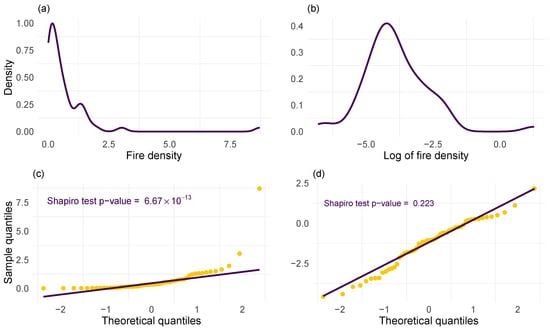 Because our main focus in this work is centered around the wildfire density, we take a closer look at this variable. Figure 2a illustrates the distribution of the wildfire density. This distribution is heavily right-skewed and does not follow a normal distribution. This non-normality is not unusual in real-world datasets but adversely affects the accuracy of many statistical models [,]. We apply a log transformation to the observed wildfire density to reduce the skewness, resulting in a distribution that appears more symmetric, as shown in Figure 2b. While visual diagnosis can provide a general idea about the distribution, a more robust and rigorous test should be performed to analyze the normality. We utilize the Shapiro test []. As shown in Figure 2c, the qq plot does not follow the theoretical normal distribution and the p-value associated with the Shapiro test verifies the non-normality of the observed wildfire density. However, Figure 2d and the p-value verify the normality of the log-transformed wildfire density.