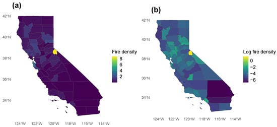 (a) The spatial distribution of the wildfire density and (b) its log-transformed values across regions in the state of California. Counties with a higher fire density are represented by warmer colors, while cooler colors indicate a lower fire density.