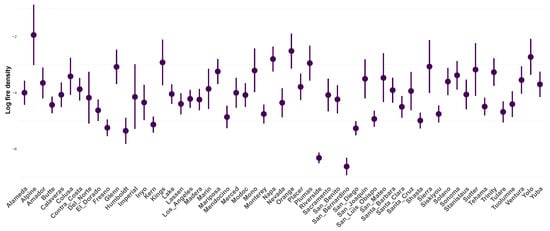 Due to the heterogeneous nature of the geographical and environmental landscape of California, we first analyze how the wildfire density differs across counties. We first use Bayesian ANOVA to provide statistical evidence of the variability in the wildfire density among the counties. We then use the insights gained from this initial analysis to classify the counties with the highest and lowest wildfire densities. The findings from the Bayesian ANOVA model for the comparison of the wildfire density among all 58 counties in California are displayed in Figure 4. The x-axis and y-axis show the names of the counties and the log of the wildfire density, respectively. The plot contains 80% posterior credible intervals for each county. The longer the vertical bar, the greater the variability and uncertainty in calculating the averages.