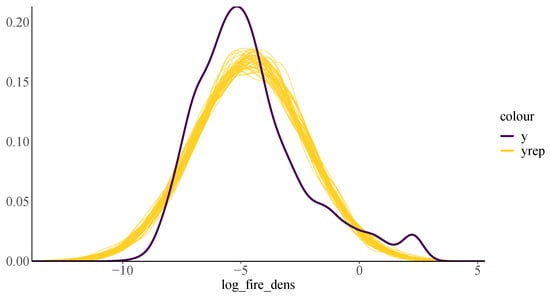 To assess how well our ANOVA model replicates the observed data, we performed a posterior predictive check. Figure 5 confirms that the model is not biased and can produce predictions (yellow curves) with characteristics similar to the observed wildfire density data (dark purple curve). The capacity of the model to capture the key characteristics and intrinsic variability (such as spread and central tendency) in the data is demonstrated by the relative consistency between the posterior predictive values and the data.