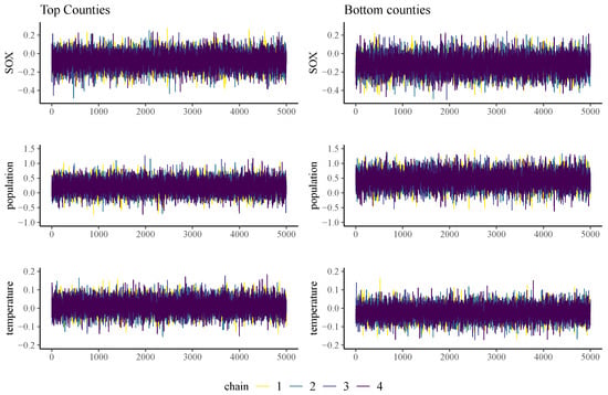 Figure 6 and Figure 7 show the MCMC trace plots for the factors to compare the different factors among the top and bottom counties. Based on the distinct patterns in the trace plots, we can identify and compare the influences of the predictors among the top and bottom counties (discussed in Section 5). These plots can also be used as diagnostic tools to ensure the convergence of the MCMC chains to a stationary distribution and for effective parameter space exploration. All trace plots demonstrate consistent and reasonable behavior and mix quickly for both county groups. This proves the stability of our Bayesian regression model and shows that the algorithm effectively navigates the parameter space and provides robust estimates for the considered predictors.