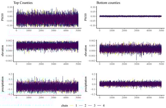 Trace plots of factors exhibiting differential effects on top and bottom counties. The trace plots also provide an assessment of the convergence and mixing of the Bayesian regression model for the selected factors.