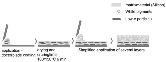 The coating consists of two functional layers. The first layer is based on aluminium as an underlying material. Here, aluminium particles (ECKART GmbH, Hartenstein, Germany) are directly integrated into the silicone matrix. Various materials for particles have been defined and used as low-emitting (low-e), whereby the focus is on silver and aluminium due to their very good radiation-optical properties. Considering the requirement of economic feasibility and the associated more cost-effective production, the benefits of low-emitting particles are examined and highlighted in this work using the example of aluminium.