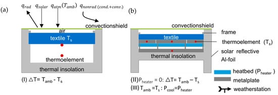 In contrast, the second setup (see Figure 4b) is geared towards quantifying the actual cooling capacity in watts per square meter. For this purpose, two identical setups incorporate integrated heating plate systems. This configuration enables the measurement of a reference material alongside the sample material for comparative analysis. By implementing a feedback-controlled heating plate system, the cooler temperature (Ts) is kept equal to the ambient temperature (Tamb). The cooling capacity can be determined using method (II), where the heating power Pheater is set to zero so that the maximum temperature reduction of the sample can be measured (ΔT = Tamb − Ts). To measure the cooling performance in W/m2, Method (III) uses the feedback system to maintain the temperature of the cooling material at the constant level of the ambient temperature (Tamb = Ts), so that the net cooling power (Pcool) can be determined by the initiated heating power (Pcool = Pheater). The temperature difference between the environment and the textile sample is kept to less than 0.2 °C throughout the entire measurement period. By implementing a “Guarded-Ring” system separating the metal plate into a core and a frame plate based on the standard test method for thermal conductivity (Guarded-Hot-Plate) [37], a one-dimensional heat transfer between the core and the sample is ensured, and side losses are limited [38]. The measuring area of the core and, thus, the surface of the material is 100 ± 0.5 cm2. To measure the cooling capacity in watts per square meter, self-adhesive silicone heating mats (RS Components GmbH, Frankfurt am Main, Germany) are attached below the metal plates. The heating mats are connected to the power supply unit HMP4030 3-CH (Rohde & Schwarz, Munich, Germany). The thermocouples NiCr-Ni (Ahlborn Mess- und Regelungstechnik GmbH, Germany) of type K temperature sensors are placed in the metal plate so that the measuring tip sits exactly in the middle of the respective plate. Due to the low thickness of the aluminium plate, the exact temperature of the heating plate, and thus Ts can be determined. For the frame plate, two temperature sensors are used, and the average value is calculated from this. The schematic representation of the test modules can be seen in the Supplementary Materials Figure S3.