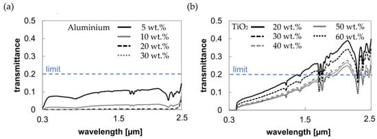 An aluminium particle concentration of 20 wt.% reduces the solar transparency to less than 1%. At the same time, TiO2 as a reference material does not reduce the transmission in the solar range below the defined threshold of 0.2, even with high particle concentrations of 60 wt.%.