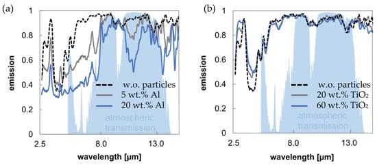 The respective lowest and highest particle concentrations are shown here. Additionally, the spectrum of the textile coated only with the matrix material, silicone, without (w.o.) the addition of particles, is presented as a reference sample. The addition of aluminium particles in the high-emitting silicone system influences the emission curve in the mid-infrared range (especially between 2.5–13 µm), depending on the concentration. Despite the material-specific low emission value of low-e materials, a total emission power in the atmospheric window (8–13 µm) of >75% (see Figure 6a) is reached. Thus, the direct integration of metal particles in a highly emissive material like silicone can result in a reasonably high emission power. Additionally, aluminium particles can reduce the absorption outside the atmospheric window between 2.5–8 µm depending on the concentration, leading to lower absorption of atmospheric radiation.