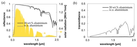 Influence of the Al particles on the spectral response compared to the reference coating. Coating thickness first layer: 60 ± 10 µm, particle concentration first layer: 20 Wt.% aluminium; coating thickness second layer: 200 ± 15 µm, particle concentration second layer: 40 Wt.% TiO2 on PES 65 g/m2. Reference coating: first layer: 60 ± 10 µm w.o. particles, second layer: 200 ± 15 µm with 40 Wt.% TiO2 on PES 65. (a) Solar reflectance; (b) Solar transmittance.