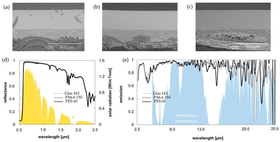 Optical and spectral investigation of substrate independence. (a) PA6.6 150 g/m2, layer thickness: 1st layer: 65.84 ± 11.36 µm, 2nd layer: 194.39 ± 5.97 µm; (b) PES 65 g/m2, layer thickness: 1st layer: 64.93 ± 10.14 µm, 2nd layer: 187.80 ± 3.46 µm; (c) Glass 163 g/m2, layer thickness: 1st layer: 60.52 ± 18.14 µm, 2nd layer: 187.80 ± 3.46 µm (SEM TM1000 × 250, Hitachi); (d) Solar reflection; (e) Emission in MIR with the atmospheric window between 8–13 µm.