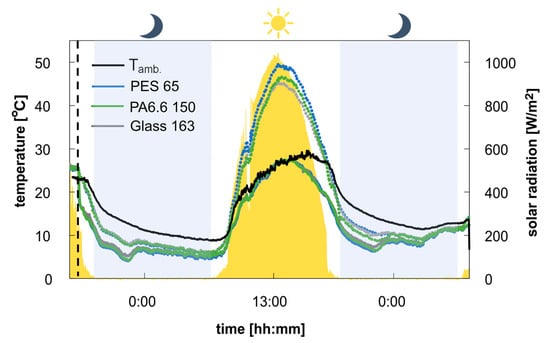 The temperature difference is measured for the coated and uncoated system on three different substrate materials PES 65, Glass 163, and PA6.6 150 for >24 h (see Figure 9).