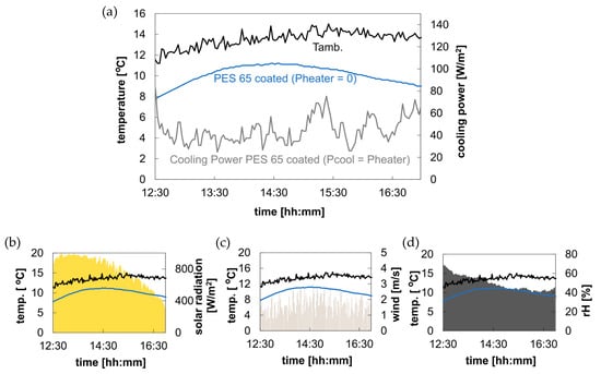 Maximum temperature reduction and cooling power of the coated sample during the day. Sample: PES 65 g/m2 coated (total coating thickness: 250 ± 20 µm). Representation of the heat input (Pheater) by the average period 10 at 150 data points. Measured with the test module with integrated heating plate system on 16 October 2023 on the roof of the DITF. (a) Temperature profile and cooling capacity of the samples; (b) Temperature of the sample and Tamb; against solar radiation (max. 995.5 W/m2); (c) Temperature of the sample and Tamb; against the average wind speed (ⵁ 1.7 m/s); (d) Temperature of the sample and Tamb against the relative humidity (ⵁ 50.0%).