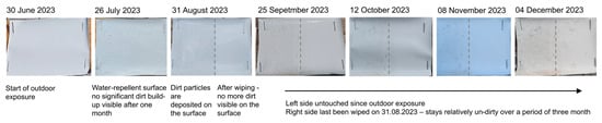 The coated surface is water-repellent, so raindrops can wash away some of the attached dirt. August was a relatively dry and dusty month, during which most of the dirt particles attached to the surface. After wiping the right side clean again, it remained relatively clean over the next couple of months, demonstrating a certain self-cleaning effect due to the high hydrophobicity of the silicone coating.