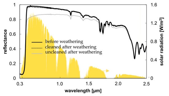 Spectral measurement and comparison of solar reflectance before weathering, cleaned after weathering and uncleaned after weathering. Sample: PES g/m2 coated (total coating thickness: 250 ± 20 µm).