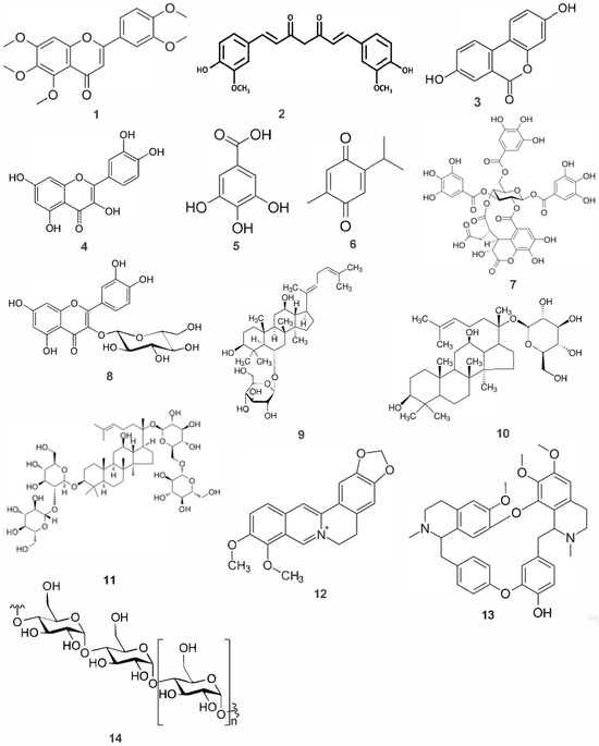Structure of medicinal herb-derived metabolites with gut microbiota-mediated action mechanisms. The compounds displayed are 1. sinensetin, 2. curcumin, 3. urolithin A, 4. quercetin, 5. gallic acid, 6. thymoquinone, 7. chebulinic acid, 8. isoquercetin, 9. ginsenoside Rh4, 10. ginsenoside compound K, 11. ginsenoside Rb1, 12. berberine, 13. berbamine, and 14. basic polysaccharide structure.
