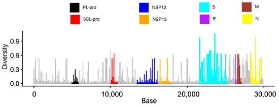 Bar plot showing the relative amount of genetic diversity across SARS-CoV-2 based on 2776 genomes. Selected nonstructural proteins (Papain-like protease PLpro; 3C-like proteinase, 3CL-pro; RdRp RNA-dependent RNA polymerase, NSP12; helicase, NSP13) and structural proteins (spike, S; envelope, E; membrane, M; and nucleocapsid, N) are shown to highlight their overall variation.
