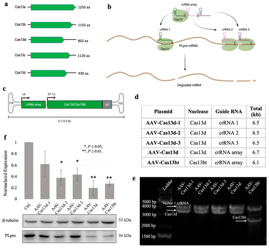 Next, we designed the crRNA sequences targeting the selected sites of PLpro mRNA, according to the secondary structure of PLpro mRNA. First, the secondary structure of PLpro mRNA was generated using UFold Webserver v1.2 (https://bio.tools/ufold accessed on 6 June 2020). From the gRNA sequences generated by the online Cas13 guide RNA designing tool [20], we randomly selected three crRNA sequences targeting the middle and tail regions of the PLpro transcript (Figure 2a). We built five plasmids that contain the desired compact Cas13/crRNA systems (Figure 2c,d). The AAV-Cas13d-1 plasmid contains crRNA 1 that targets the middle region of the PLpro transcript and the endonuclease Cas13d. Computational analysis revealed the double-stranded hairpin structure of the regional PLpro mRNA. The AAV-Cas13d-2 and AAV-Cas13d-3 plasmids contain two crRNA sequences that target the tail region of PLpro transcript. Computational analysis revealed the single-stranded structure of the crRNA 2 targeting region and the double-stranded structure of the crRNA 3 targeting region (Figures S3 and S4). The AAV-Cas13d plasmid contains a crRNA array that simultaneously targets all three regions and the Cas13 endonuclease. Meanwhile, AAV-Cas13bt plasmid contains the same crRNA array but the ultrasmall Cas13bt endonuclease. All plasmids were validated to ensure they were correct (Figure 2e).
