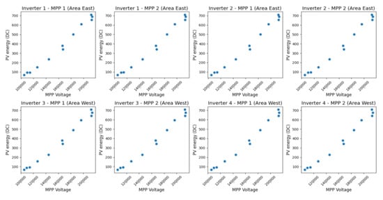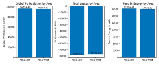 The bar chart was the primary tool used for comparing east- and west-oriented solar panels [16]. Bar charts are effective for comparing categories such as inverters or MPPs. Additionally, scatter plots were employed to investigate values such as global PV radiation or PV energy (DC) for potential dependencies in greater detail [17].