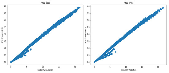 As previously established in the correlation matrix, this relationship was also verified with another chart. Figure 6 illustrates the correlation between global PV radiation and PV energy (DC). With the exception of a few outliers, a one-to-one relationship is confirmed, exhibiting a linear growth pattern.