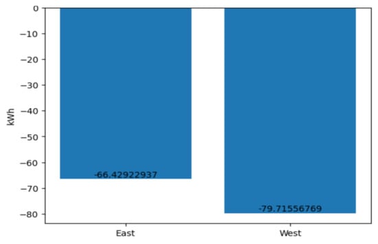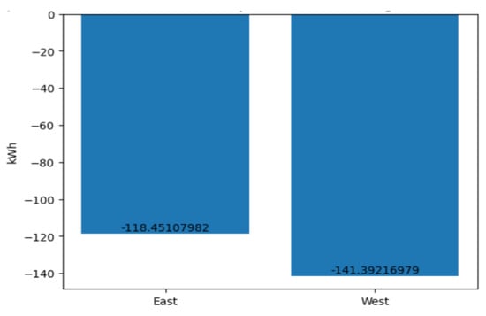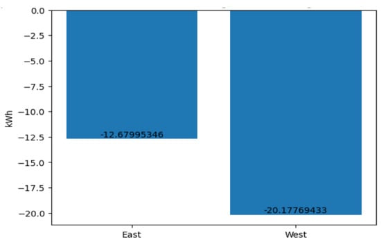 The last notable discrepancy was identified in the loss incurred due to a deviation from the specified nominal module temperature. This column quantifies the loss of energy resulting from a deviation in operating temperature from the specified nominal temperature of 25 degrees Celsius. The standard temperature of 25 degrees is used as the nominal temperature because it is the temperature at which solar panels are tested under standard conditions. It is important to note that if the temperature exceeds 25 degrees, the losses will be higher; conversely, losses are lower when the temperature is below 25 degrees [26]. This phenomenon was also evident in the dataset, with some values exhibiting a positive range. In terms of quantitative data, the eastern side exhibited a total loss due to deviation from the nominal module temperature of −66.43 kWh, while the western side demonstrated a loss of −79.72 kWh (see Figure 10).