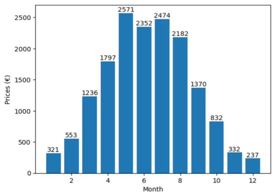 The second key figure is the grid feed-in energy. Similar to the global PV radiation data, the findings indicate that the greatest amount of energy could be fed into the main grid between the months of April and September, as illustrated in Figure 11. Based on an average price of 46.27 cents per kilowatt-hour, the total revenue for the year would be €15,423.47, as shown in Figure 12.