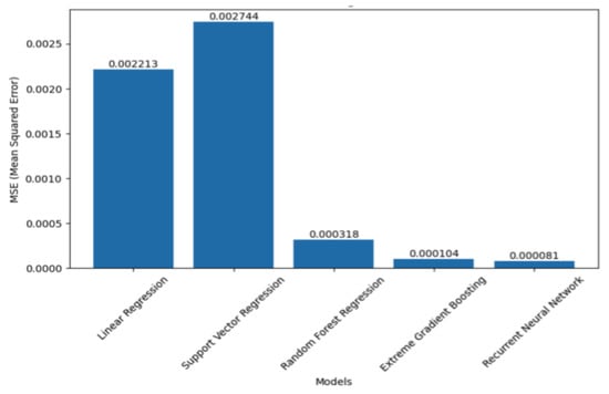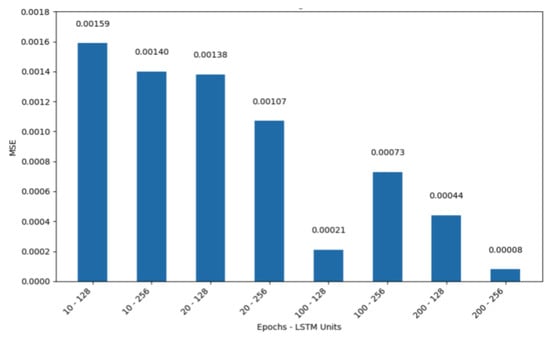 As illustrated in Figure 13, the root-mean-square errors for Linear Regression and Support Vector Regression were 0.002213 and 0.002744, respectively. In contrast, Random Forest Regression and XGBoost demonstrated the greatest efficacy in this use case, as evidenced by their lowest mean square error (MSE) and shortest processing time. The MSEs for Random Forest Regression and XGBoost were 0.000318 and 0.000104, respectively. The Recurrent Neural Network (RNN) yielded the most optimal results, with an MSE of 0.000081 for the configuration using 200 epochs and 256 LSTM units, and 0.000210 for the configuration using 100 epochs and 128 LSTM units (see Figure 14).