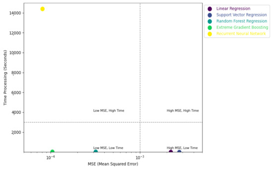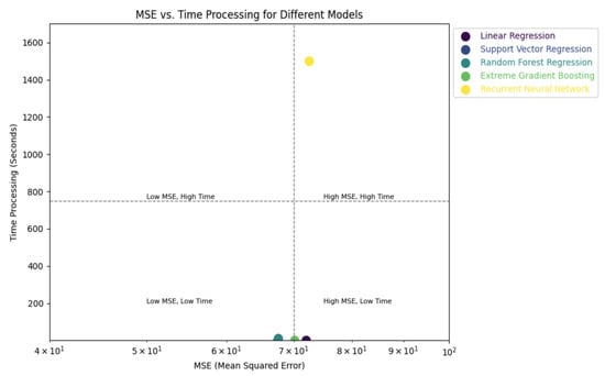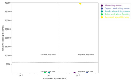 In terms of processing time, Linear Regression and Support Vector Regression were the most efficient of the five models, requiring only 1 s and 5 s, respectively. The difference in processing time between Random Forest Regression and XGBoost was minimal, with averages of 29 s and 24 s, respectively (see Figure 15). It is important to note that the Recurrent Neural Network (RNN) required a significantly longer training period, especially when adjusting multiple parameters. The processing time was four hours for the configuration with 200 epochs and 256 LSTM units, and two hours for the configuration with 100 epochs and 128 LSTM units.