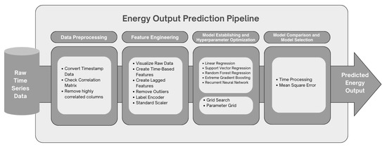 The end-to-end pipeline demonstrated how energy was predicted from raw time series data (see Figure 18). It provided context after the key stages of the process, namely the introduction of the dataset, data preprocessing, feature engineering, and model building. This ensured a logical and clear progression. The pipeline comprised four stages: data preprocessing, feature engineering, model establishment and hyperparameter optimization, and model comparison and selection. The dataset must include time series data with weather conditions, making this model suitable for use with full-year time series datasets.