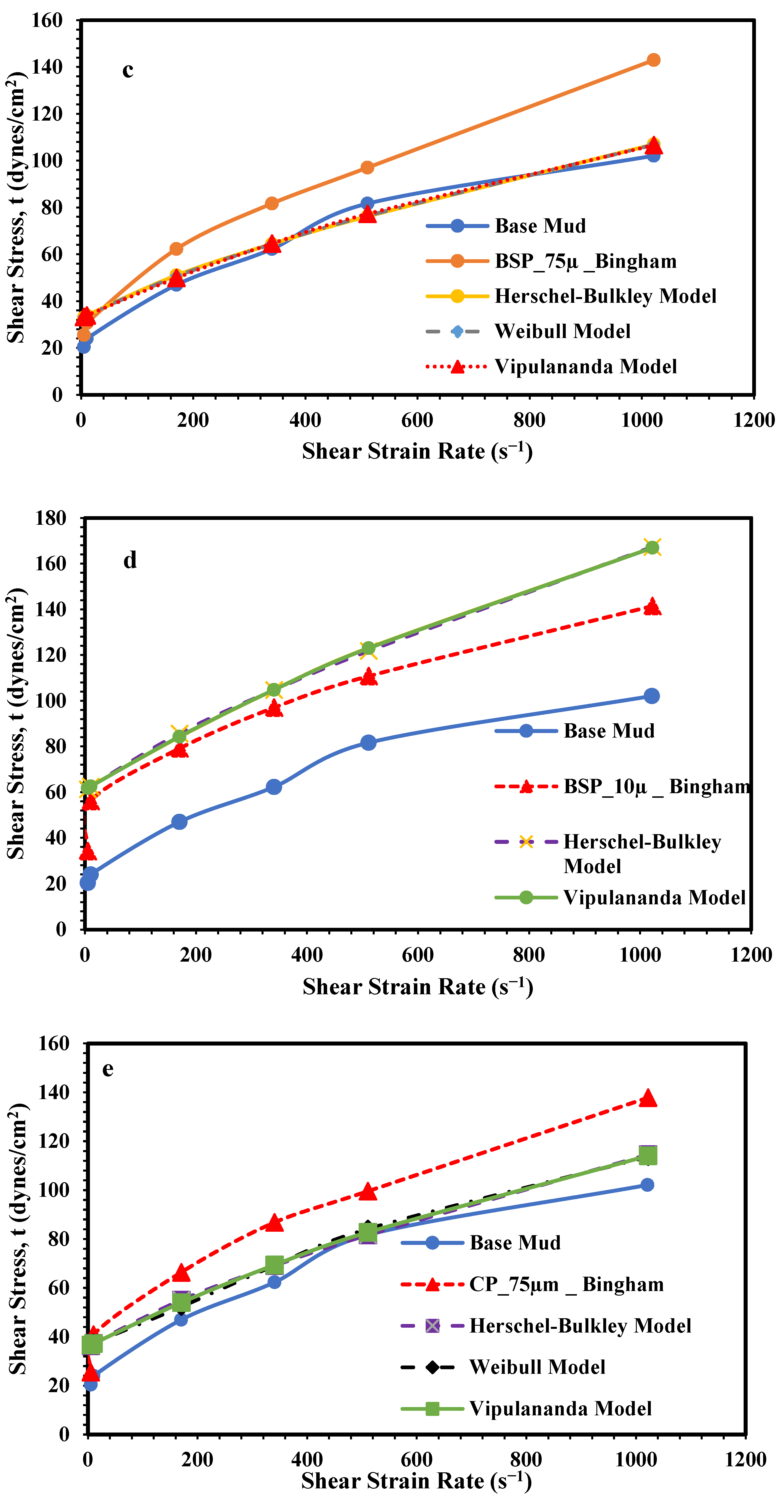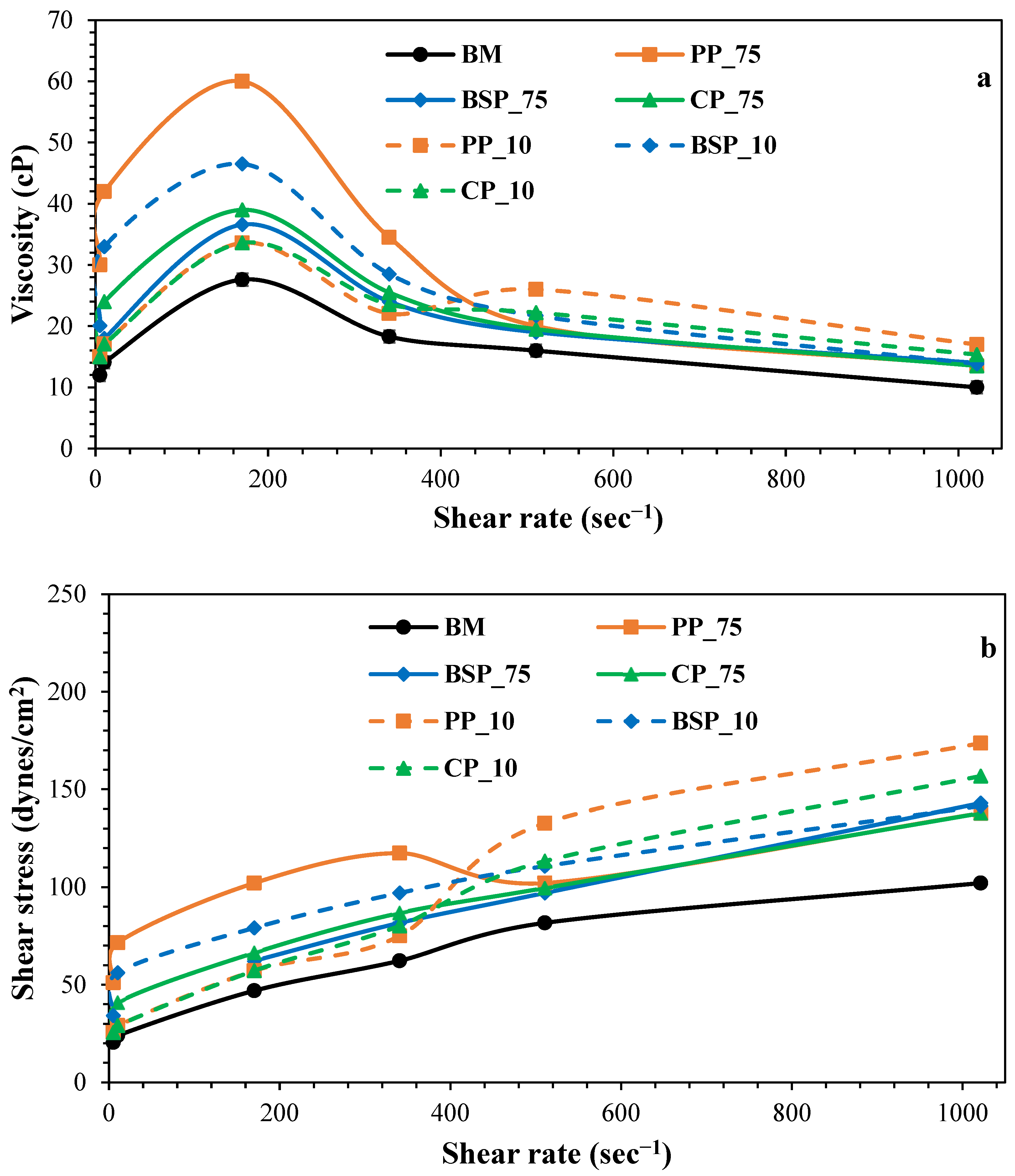 - Vegetable peel additives, particularly pumpkin peel at 10 µm (PP_10), enhance shear stress across all shear rates. PP_10 demonstrates higher shear stress compared with the 75 µm counterpart (PP_75), indicating that finer particles provide better shear resistance;