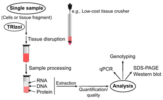 - Green, M.R.; Sambrook, J. A Single-Step Method for the Simultaneous Preparation of DNA, RNA, and Protein from Cells and Tissues. Cold Spring Harb. Protoc. 2018, 2018, pdb-prot4056. [Google Scholar] [CrossRef] [PubMed]