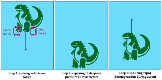 This figure illustrates the three-step plan proposed to defeat Godzilla using freon tanks, deep-sea pressure, and rapid decompression: