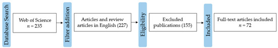 In the initial search using the keywords “pesticides” and “lipoproteins” in the WoS database, 235 articles were identified. After applying filters for language and publication type, the total was reduced to 227. Subsequently, the titles and abstracts of these articles were analyzed, resulting in the exclusion of 155 articles based solely on their subject matter. This entire process is summarized in Figure 2.