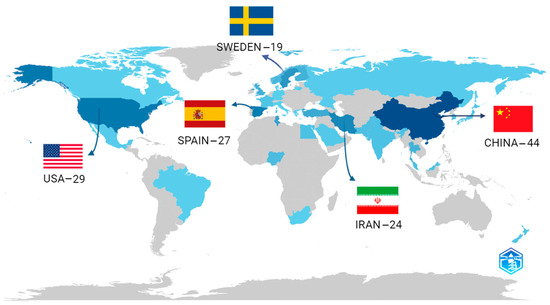 Figure 3 illustrates the evaluation of scientific production by country, highlighting the five countries with the highest outputs. China had the largest representation, with a total of 44 publications. Following China, the United States contributed 29 articles, while Spain, Iran, and Sweden had 27, 24, and 19 publications, respectively.