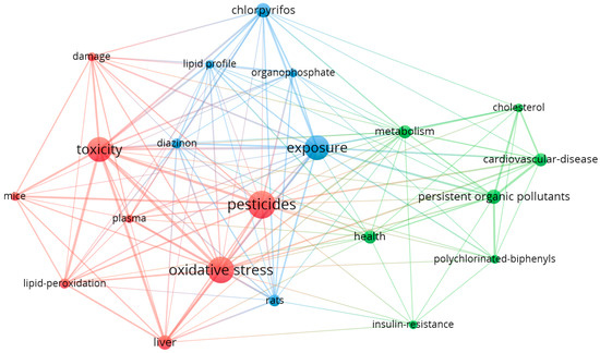 Next, a co-occurrence map of keywords was created. Out of 554 keywords identified, 21 met the threshold of appearing at least six times. The resulting visualization is presented in Figure 4, which reveals three distinct clusters represented in red, green, and blue. Notably, the word “pesticide” appeared 19 times, “oxidative stress” 18 times, and “toxicity” 17 times, all within the red cluster. In the blue cluster, the keyword “exposure” occurred 17 times. Lastly, within the green cluster, the term “persistent organic pollutant” was highlighted, appearing 10 times.
