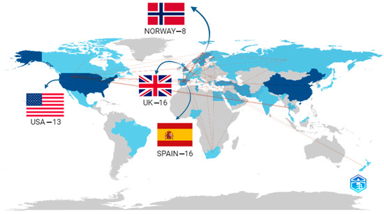 The countries with the highest number of international collaborations were the United Kingdom and Spain (Figure 5). The UK accounted for 16 collaborations, including 3 with Norway and 2 with Finland, and the remaining collaborations were with various other countries.