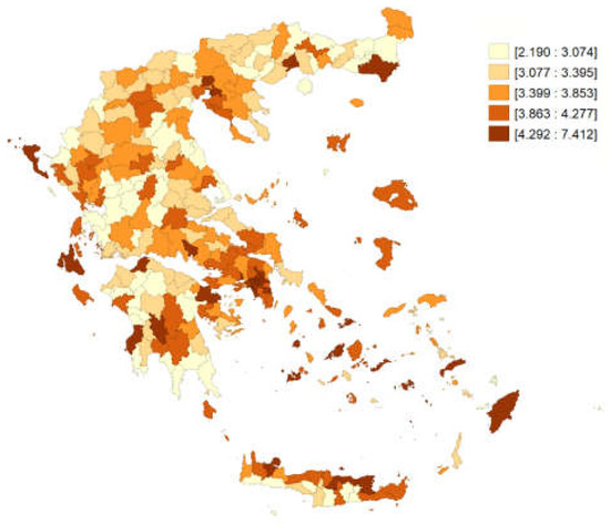 It can be observed that the indices showed two areas with high-value correlations in the two major urban areas as well as low concentrations of near values, mainly in the regions of western Greece and southern Epirus. The high values in the two large metropolitan areas were partly explained by the very large quantities of WCOs (per capita) produced there but also due to the close proximity of many municipalities.