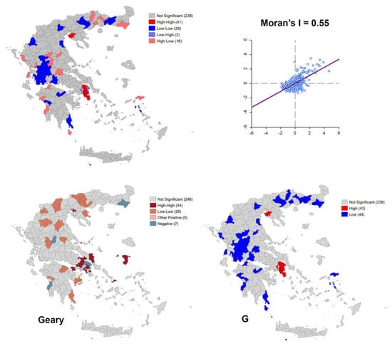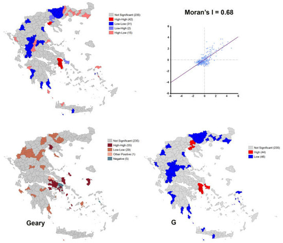 The methodology of Geographic Information Systems (GIS) as well as spatial analysis techniques were used [9,10]. GIS information belongs to the general category of intelligent systems and can be understood as a model of a smart digital map with hyperlinks. The geographical, cartographical and spatial data of this digital map are uniquely related to descriptive data. Thus, the relational connection between descriptive and spatial information can be considered the basic method of GIS. Recording data in a GIS database is a prerequisite for visualizing map distributions. In many studies, this visualization is sufficient, as it can provide a comprehensive picture of the issue under consideration. However, for a deeper investigation, it is necessary to develop a methodology in the context of spatial analysis [11,12]. In the modern literature, spatial analysis is frequently connected to the use of GIS. The basic methodology followed in the present study in terms of spatial analysis was that of spatial autocorrelation [13]. The fundamental logic of spatial autocorrelation is based on Tobler’s so-called First Law of Geography [14], which is the methodological basis of all theories and practices of spatial data analysis. According to Tobler’s law, everything is related to everything else, but near things are more related than distant ones [15]. Some indicators are used to calculate spatial autocorrelation. The most common are the global and local indices of spatial autocorrelation; Moran’s I, Geary’s C, and Getis’ G, which were used in the present study. Software such as the R version 4.4.1 programming language and the open-source software GeoDA version 1.22 and QGIS version 3.40 were used to calculate the indicators.