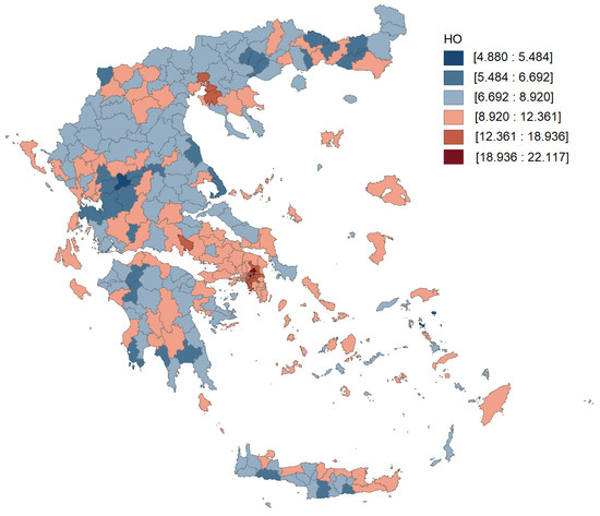 In most areas (235), no correlation was found. Moran’s I index was significant (0.68), but even in this case, the correlation was derived from very few values (top right in graph) that mainly concerned large urban areas. Without these areas, the indices showed no significant spatial correlation. Estimating the values for domestic oils, we found a correlation in terms of high values being observed in the same areas that we found for WCOs, i.e., in the two major metropolitan areas (Athens and Thessaloniki). On the contrary, we observed a concentration of low values mainly in eastern Macedonia, in mountainous areas of Pindos and in some border areas. The general picture given by all three indices is similar. The areas of the big urban centers, in which very high quantities of consumption are concentrated, seem on first sight to be the most promising. Nevertheless, there was no substantial direct correlation between WCO and HO values, and Moran’s I index was only 0.32 (Figure 6). The above results indicate that there is no clear picture concerning the geographically optimal way of collecting residual oils. The methodology has a significant limitation when applied to small islands. Most of these consist of a single unit, making it difficult to accurately estimate spatial autocorrelation indicators. This restricts the main conclusions to the mainland and larger islands, which, however, account for 94% of the total quantities.